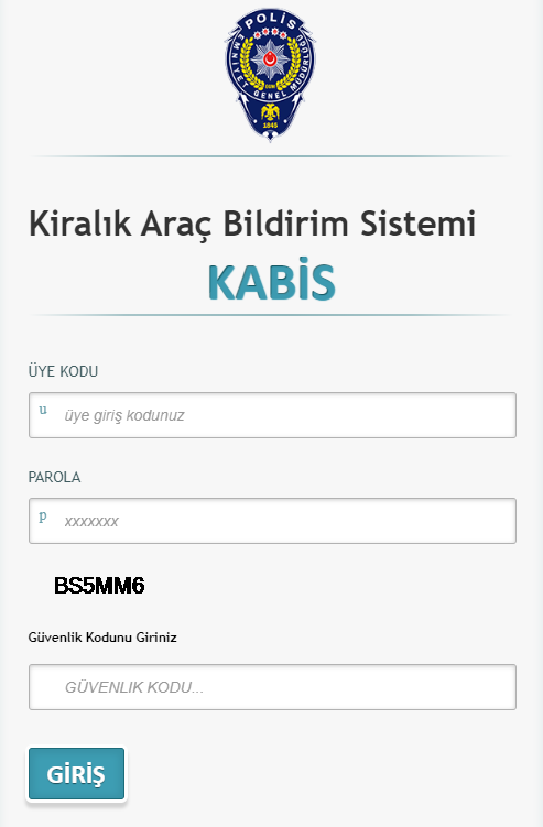 KABİS’e giriş için Emniyet Genel Müdürlüğü web sitesindeki “Kiralık Araç Bildirim Sistemi” sayfasında bulunan “Giriş Yap” butonuna tıklayarak kullanıcı adı ve parolanızı girebilirsiniz.